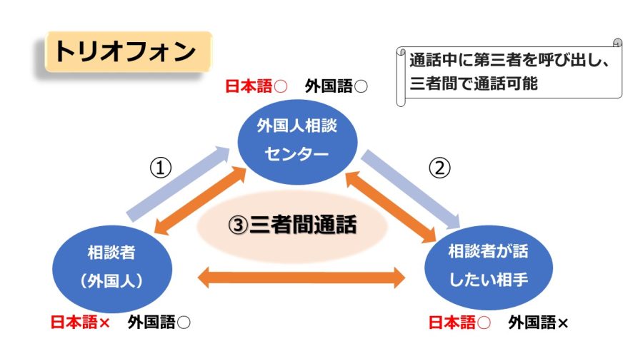 外国人相談センターでは、外国人の方が母国語で相談できるよう多言語で相談対応をしています。専門家のアドバイスが必要な場合は、通訳付きで弁護士相談を利用することができます。また、電話で市町村、学校、消費生活センターなど公的機関に相談する場合、トリオフォン(三者通話)を使って相談ができます。相談はすべて無料です(電話代はかかります)。
