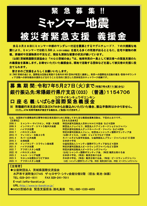 公益財団法人茨城県国際交流協会は、NGO茨城の会と共同で、ミャンマー地震による被災者に対して現地で緊急援助活動を行う公的機関やNGOを支援するため、下記のとおり義援金を募集しています。