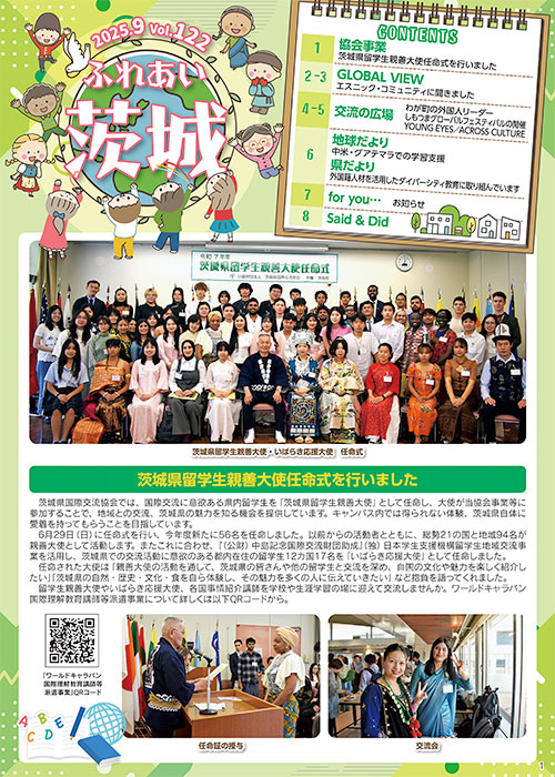 当協会の機関誌「ふれあい茨城」は、年2回(9、3月)発行しております。当協会の活動や県内の国際交流活動についての情報を掲載しています。当協会の賛助会員ほか、県内の民間国際交流団体、小中高等学校、市町村、 公共機関等に配布しています。