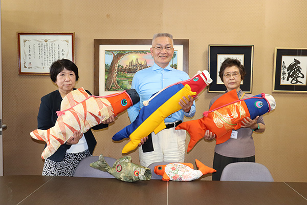 公益社団法人茨城県看護協会の中島専務理事と中山氏が、当協会を訪れ、古布を使った鯉のぼりのつるし飾り5体をご寄贈いただきました。