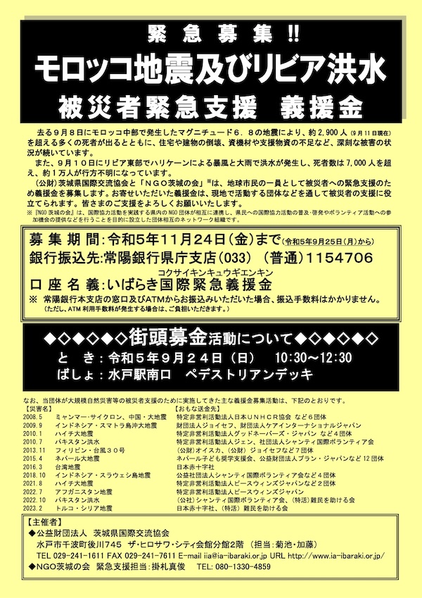 公益財団法人茨城県国際交流協会は、NGO茨城の会と共同で、モロッコ地震及びリビア洪水による被災者に対して現地で緊急援助活動を行う公的機関やNGOを支援するため、下記のとおり義援金を募集しています。
