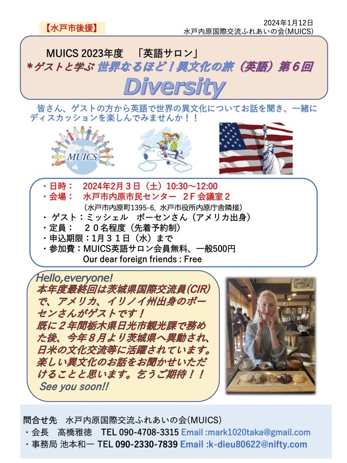 水戸内原国際交流ふれあいの会(MUICS)「ゲストと学ぶ世界なるほど!異文化の旅(英語)第6回 アメリカ編」【2月3日(土)】
