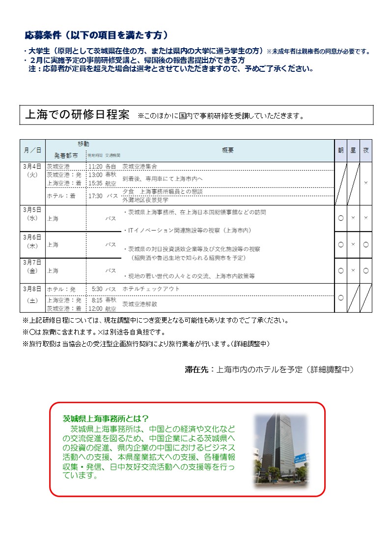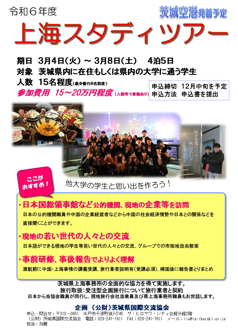 (公財)茨城県国際交流協会は、中国上海へのスタディツアーの参加者を募集します。この度、更新版チラシにて、参加費、申込締切日等を具体的にご案内いたします。