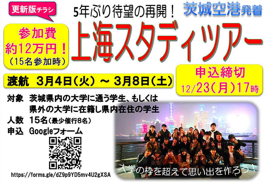 (公財)茨城県国際交流協会は、中国上海へのスタディツアーの参加者を募集します。この度、更新版チラシにて、参加費、申込締切日等を具体的にご案内いたします。