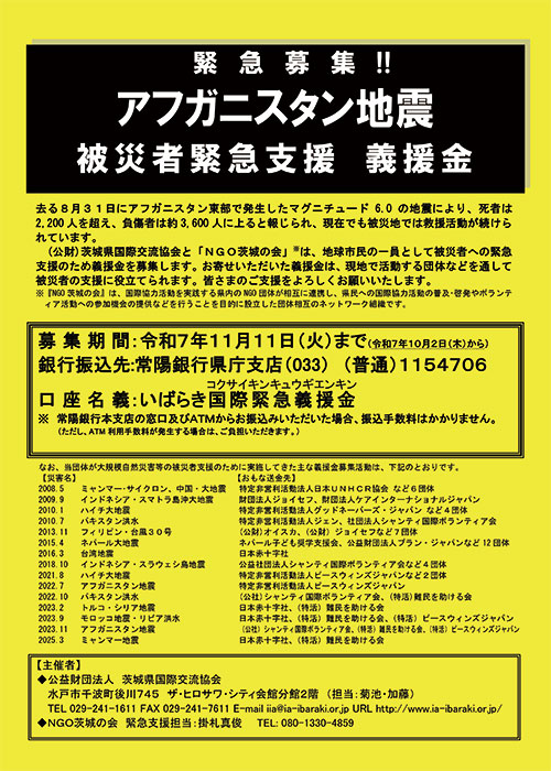 公益財団法人茨城県国際交流協会は、NGO茨城の会と共同で、アフガニスタン地震による被災者に対して現地で緊急援助活動を行う公的機関やNGOを支援するため、下記のとおり義援金を募集しています。