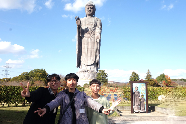 午後は、ブロンズ立像として世界最大を誇る牛久大仏を見学しました。晴れ渡る秋空の下、紅葉を楽しみながら庭園を散策する留学生の皆さんはとても心地よさそうでした。また、迫力ある大仏の大きさに「想像以上で驚きました」といった声が上がっていました。 今回の研修で企画から全面的にご協力くださいました河内町「キッチン菜の花会」および町の関係者の皆様に、心から御礼申し上げます。